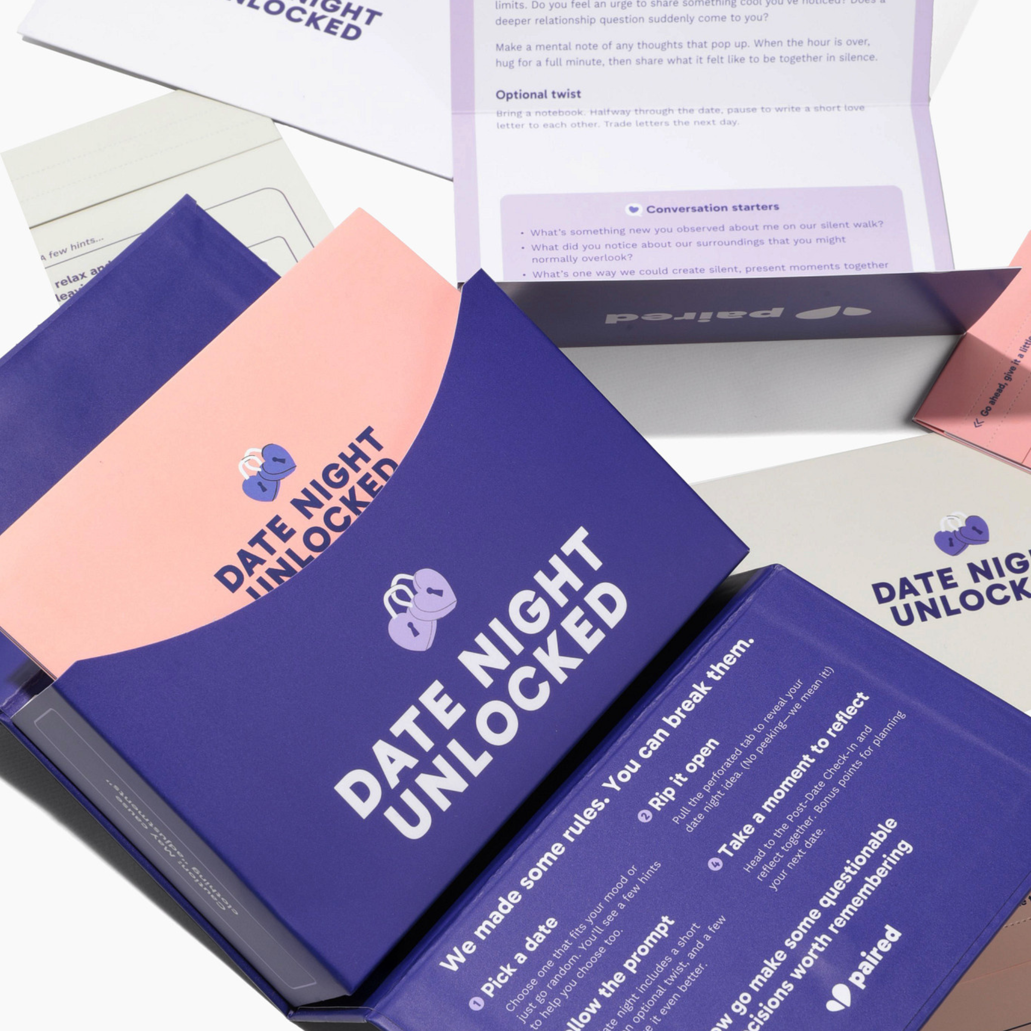 Designed with Paired’s Head of Relationships Aly Bullock (MFT), each sealed challenge blends novelty, teamwork, and a hint of romance—so you skip the planning stress and slip straight into date-night success. Open a card, share the adventure, feel the spark.
